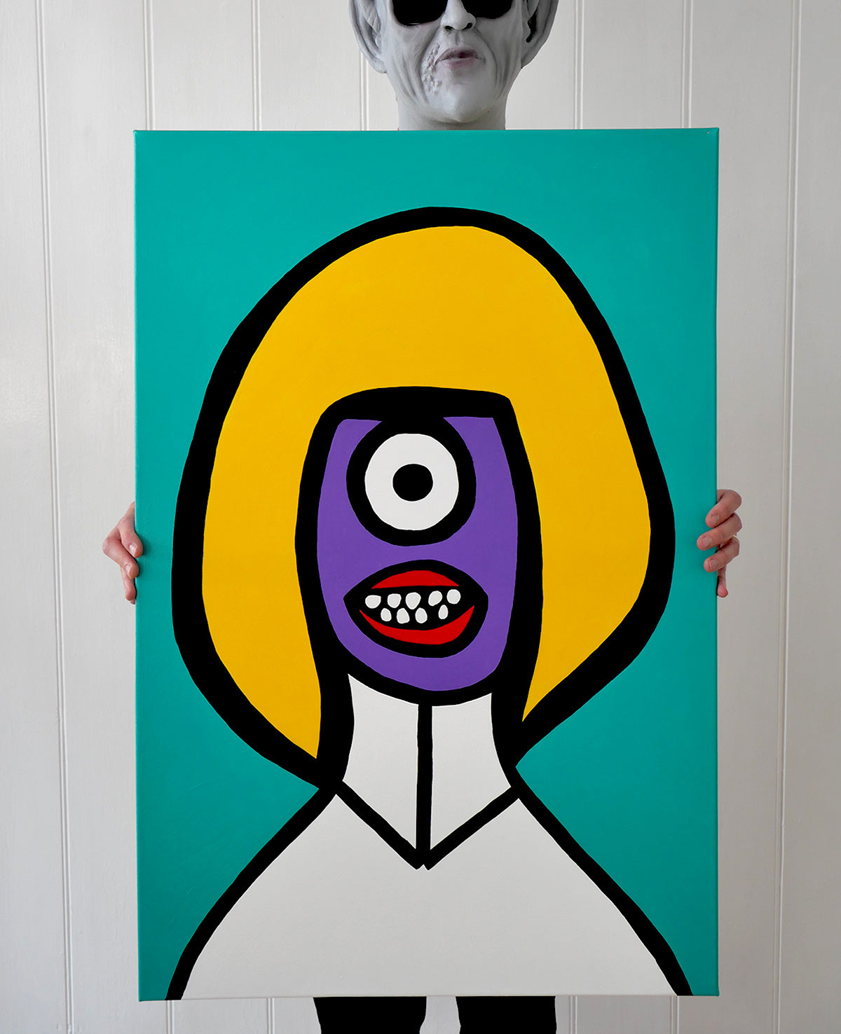 Painted in acrylic, these works blend bold graphic forms with block colours. Part sci-fi speculation, part social satire, every piece is one-of-a-kind — capturing moments of alien elegance, awkward assimilation, or quiet cosmic confidence.