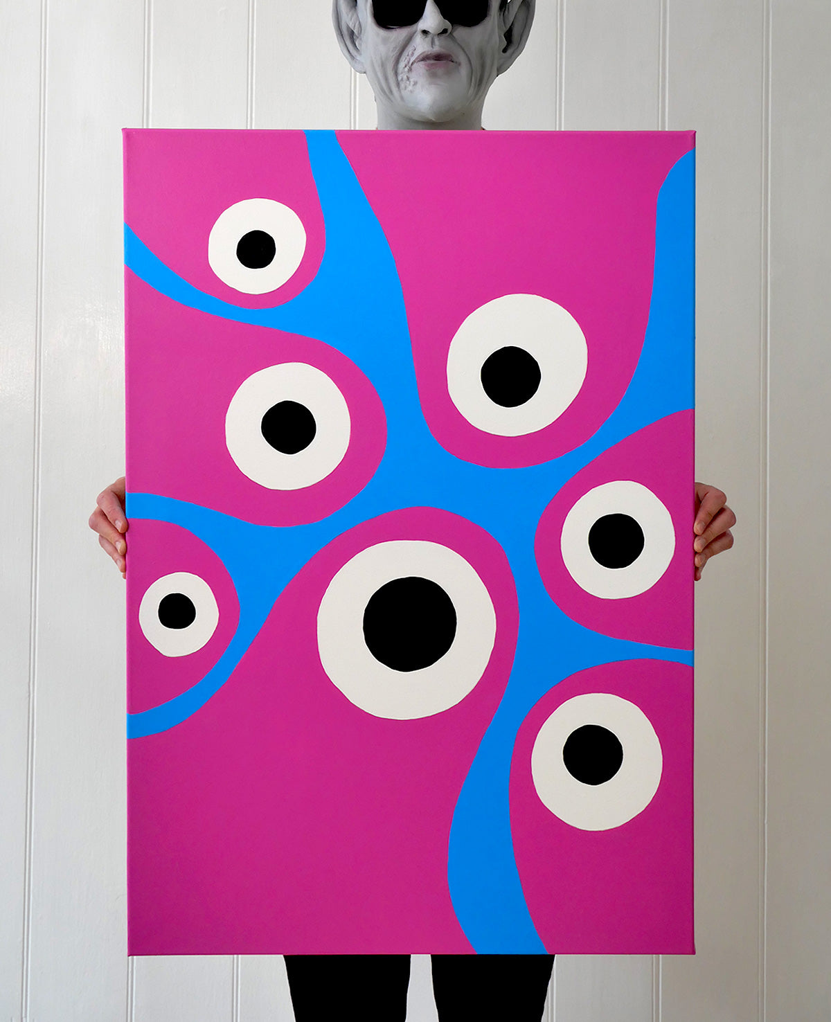 Painted in acrylic, these works blend bold graphic forms with block colours. Part sci-fi speculation, part social satire, every piece is one-of-a-kind — capturing moments of alien elegance, awkward assimilation, or quiet cosmic confidence.