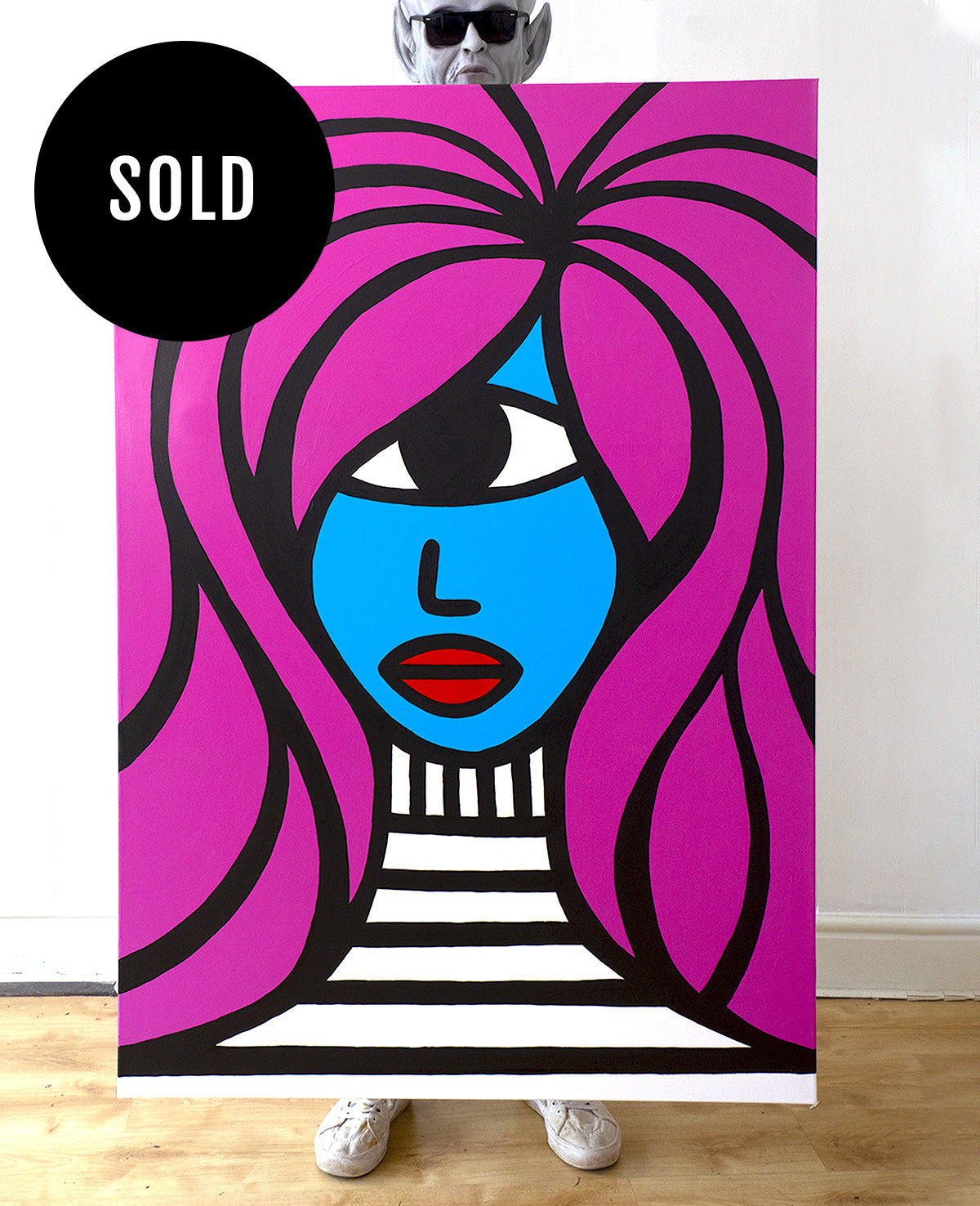 Painted in acrylic, these works blend bold graphic forms with block colours. Part sci-fi speculation, part social satire, every piece is one-of-a-kind — capturing moments of alien elegance, awkward assimilation, or quiet cosmic confidence.